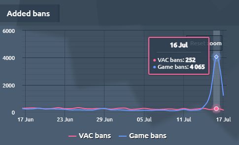 Статистикой поделился сайт Convars, отслеживающий количество игровых и VAC-банов в CS:GO. 16 июля Valve выдала 4065 игровых бана и 252 VAC-бана.