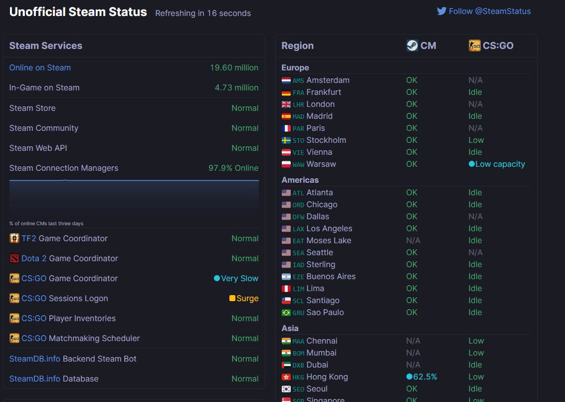 По данным сайта Steamstat.us, игровой координатор CS:GO, сервис инвентарей игроков, API игры и региональные серверы по всему миру восстановили свою работу.