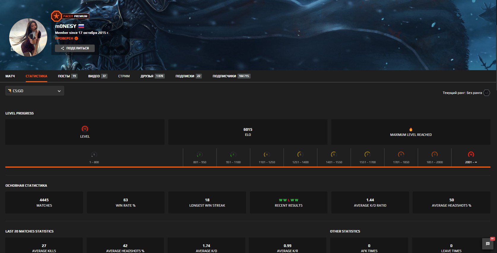 Всего российский киберспортсмен сыграл на платформе 4445 матчей с винрейтом 63% и средним K/D 1,44.