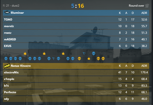 • Рейтинг Электроника в матче с Illuminar – 1,98 (это рекорд для RMR-турниров за 2 года), ADR – 179, K/D – 41-10