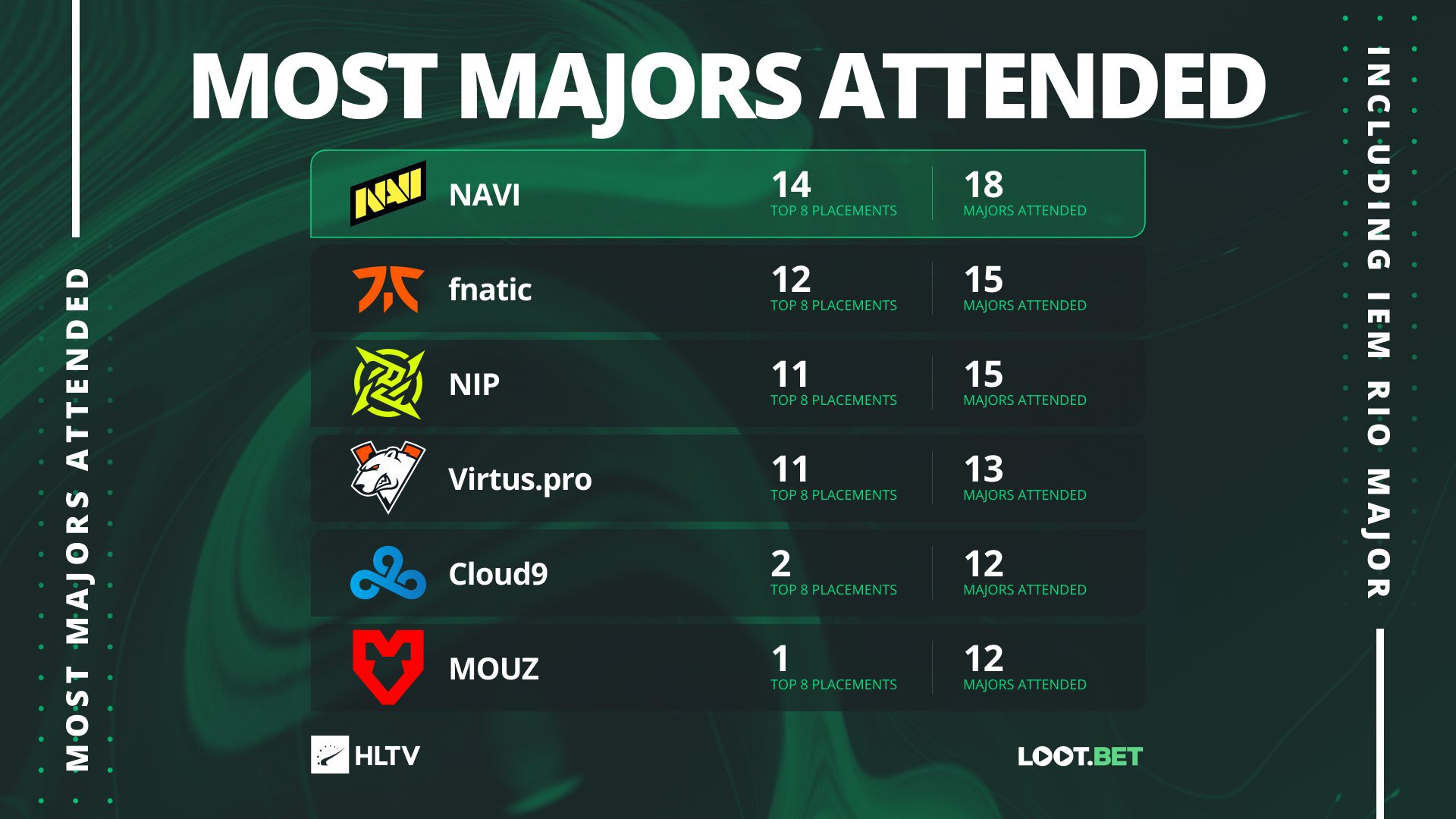 Примечательно, что Natus Vincere является единственной организацией, чья команда по CS:GO принимала участие во всех мейджорах. На 14 из 17 предыдущих чемпионатах данного разряда NAVI доходили как минимум до топ-8.
