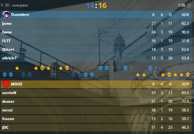 Outsiders проиграли Overpass, обгоняя Mouz по фрагам. K/D Джейма – 2,45