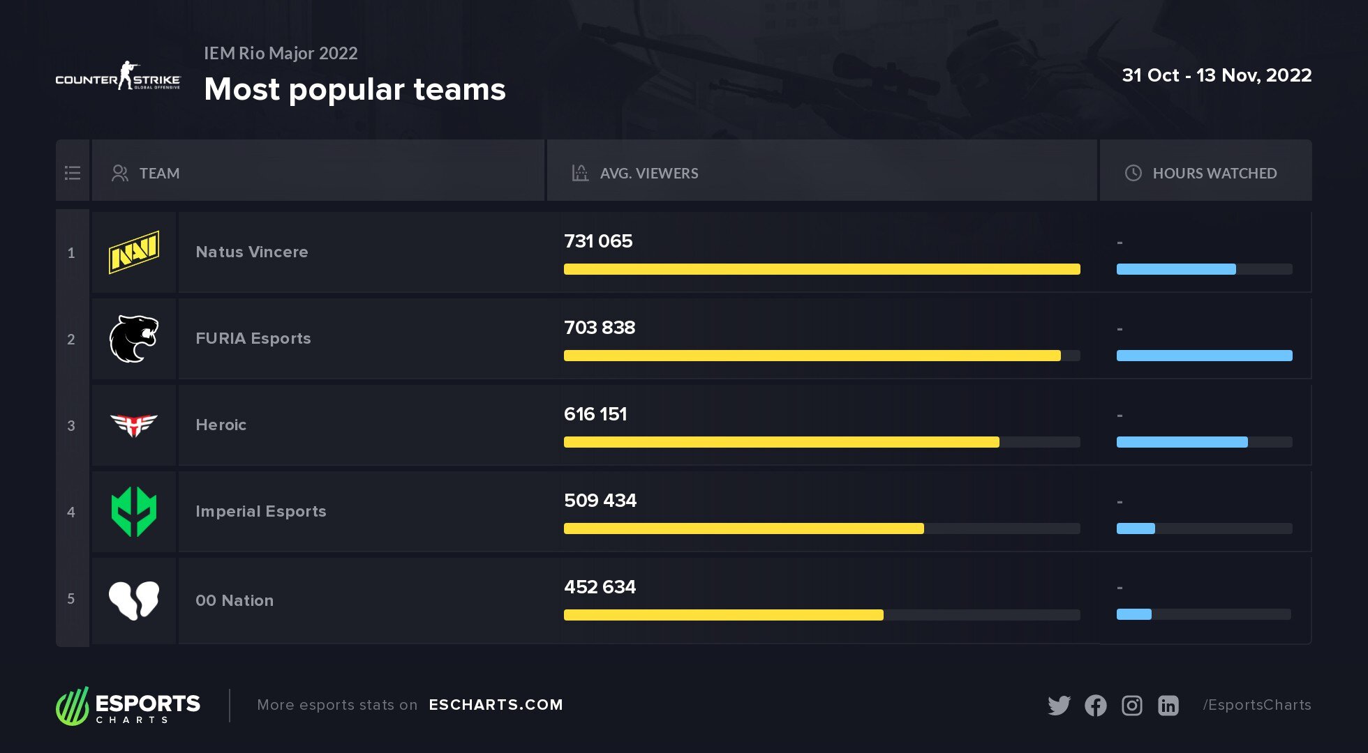 Среднее количество зрителей на матчах пятерки составило 731 065 человек. На 2-м месте идет бразильская Furia, в среднем собиравшая 703 838 смотрящих.