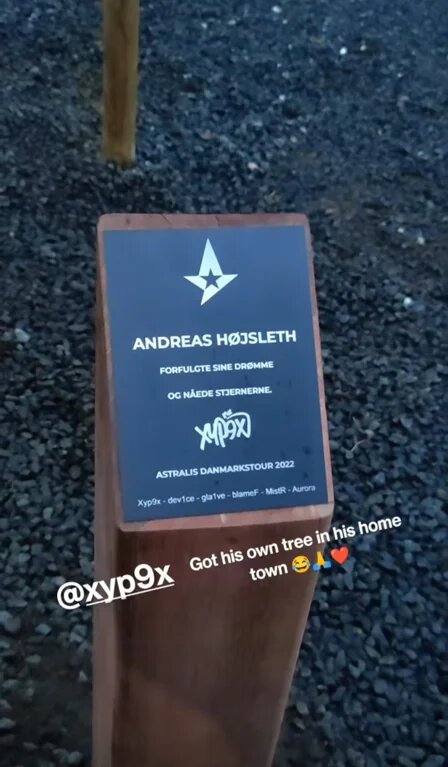 «Следовал своим мечтам и достиг звезд», – написано на табличке рядом с деревом. На табличке также перечислен состав Astralis и размещен автограф Xyp9x’a.