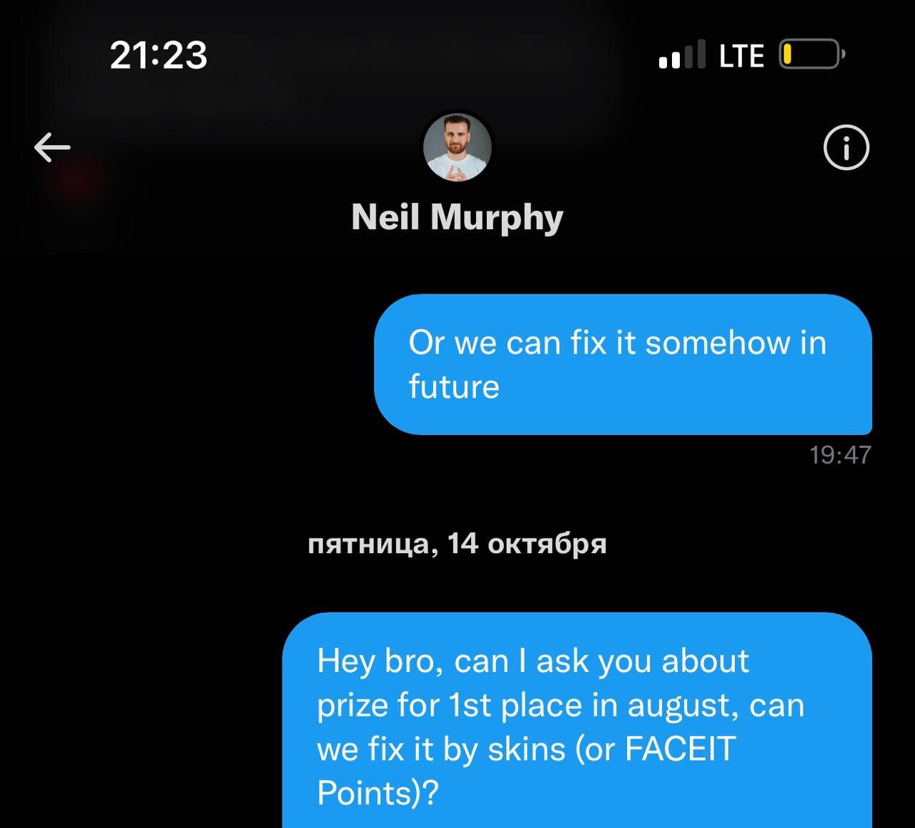 «Neil_M’у (Кибер: Neil_M – главный админ FPL) было на меня пофиг до тех пор, пока я не написал и не отметил Faceit [в твиттере]. На скрине можете увидеть, что он игнорил меня с сентября, и, короче, ему пофиг на игроков, он делает, что хочет.