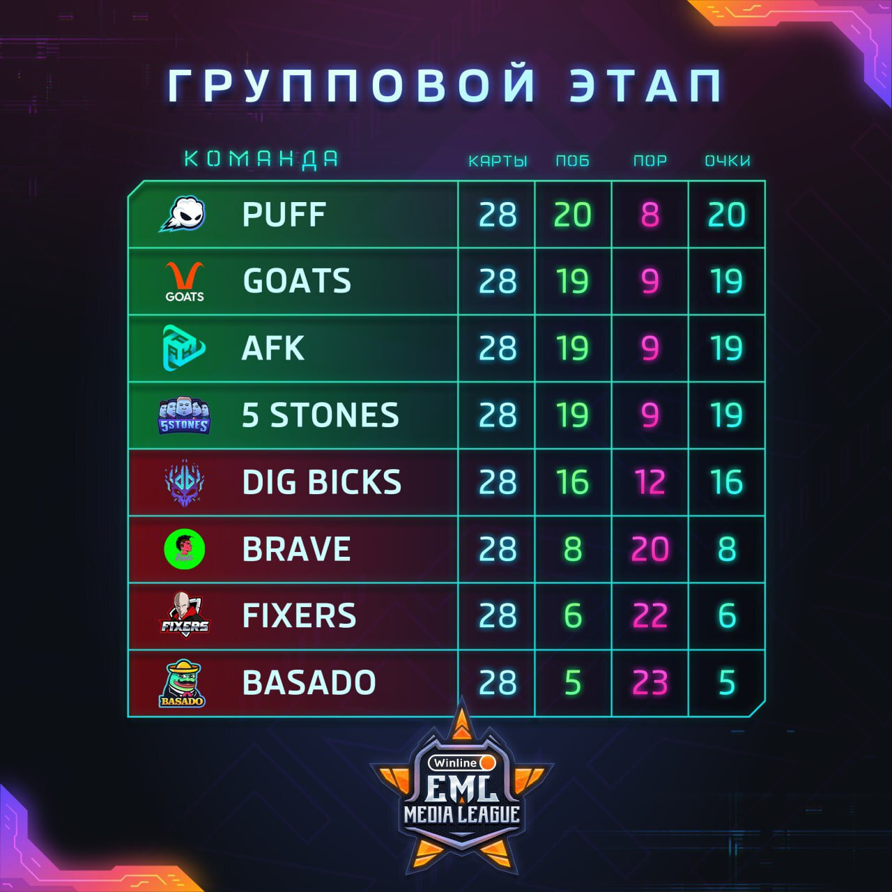 По его итогам определись четыре команды, которые сыграют в плей-офф: PUFF с Бустером и Аункером, GOATS с Димой и Мегарашем, 5 STONES с Моу и Курашом и AFK с Джерри и Анастейзом.