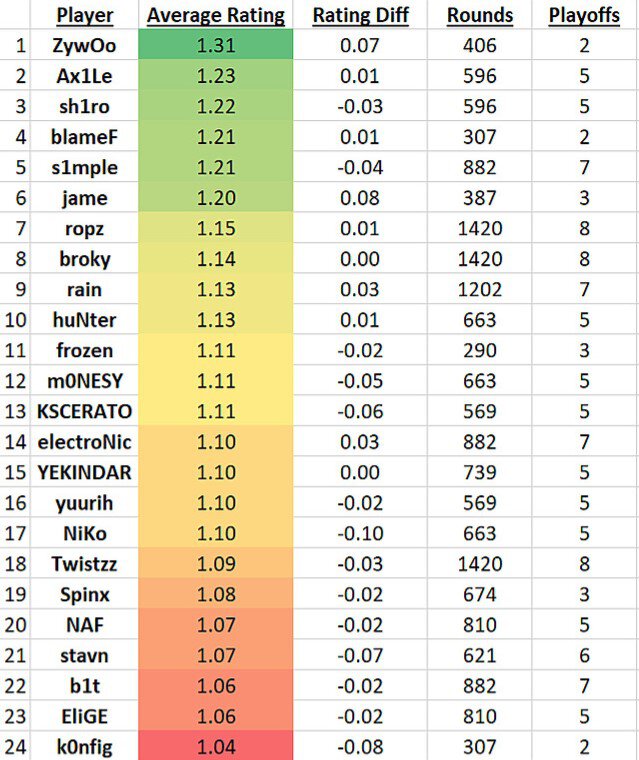 В топ-3 рейтинга вошли Сергей «Ax1le» Рыхторов (1,23) и Дмитрий «Sh1ro» Соколов (1,22). Они пять раз проходили в решающую стадию чемпионатов.