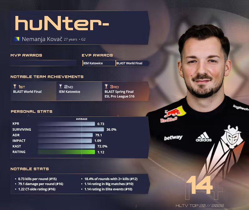 Игрок G2 Неманья «Hunter» Ковач занял 14-ю строчку в итоговом топе игроков по версии HLTV за 2022 год.