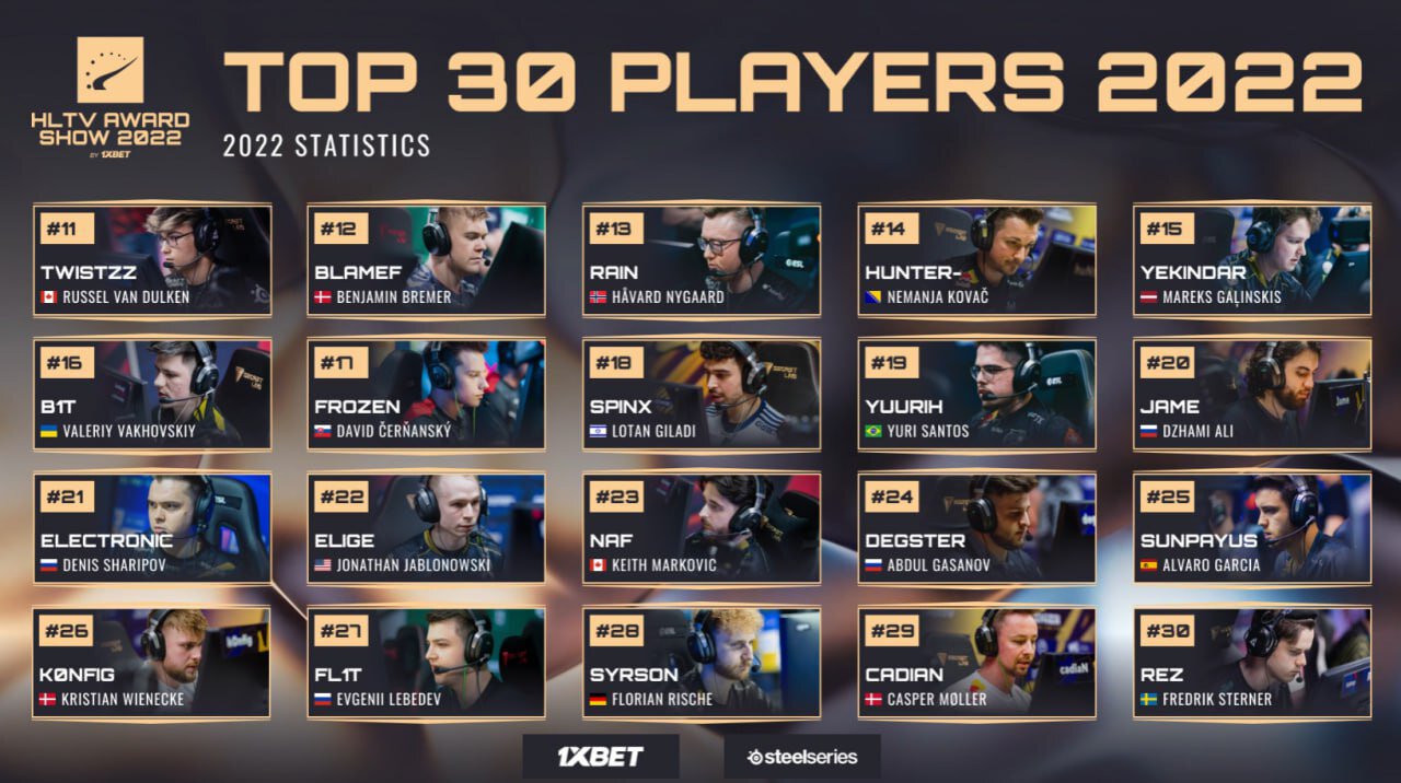 HLTV опубликовал список игроков, не вошедших в двадцатку лучших игроков 2022 года от HLTV.