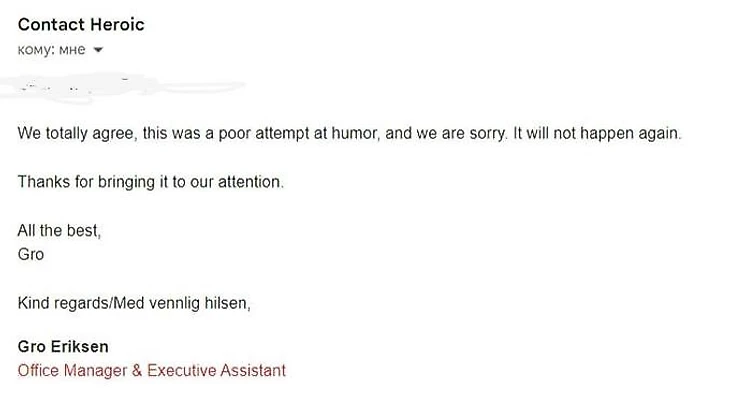 «Мы полностью согласны, это была неудачная попытка пошутить, мы извиняемся. Этого больше не повторится. Спасибо, что помогли нам заметить это. Всего наилучшего». — написал в своем письме менеджер Heroic.
