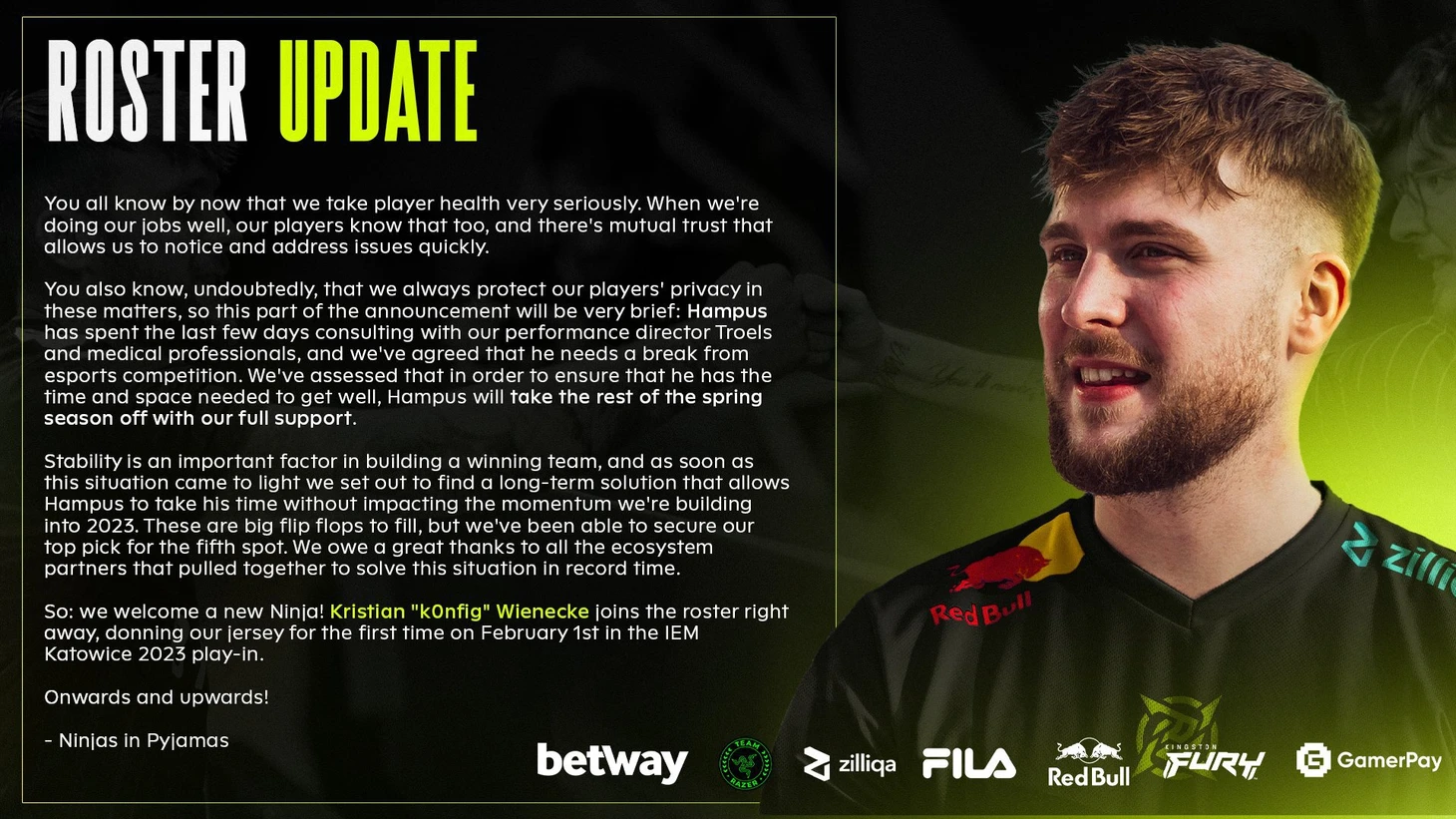 Причиной данной замены стали проблемы со здоровьем Хампуса. Киберспортсмен пропустит весенний игровой сезон. Организация заявила, что продолжит финансово поддерживать игрока в период больничного.