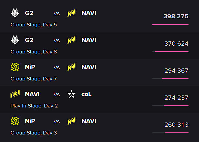 Первые два места заняли игры против G2, их смотрело 370 тысяч и 398 тысяч зрителей. В топ-5 также попали игры с Ninjas in Pyjamas и Complexity.