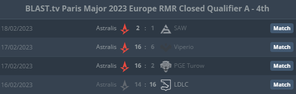 Astralis прошла на RMR к мейджору в Париже со статистикой 3-1: команда проиграла LDLC (65-е место в мире) и обыграла PGE Turow (181-е место в мире), Viperio (138-е место в мире) и Saw (20-е место в мире).
