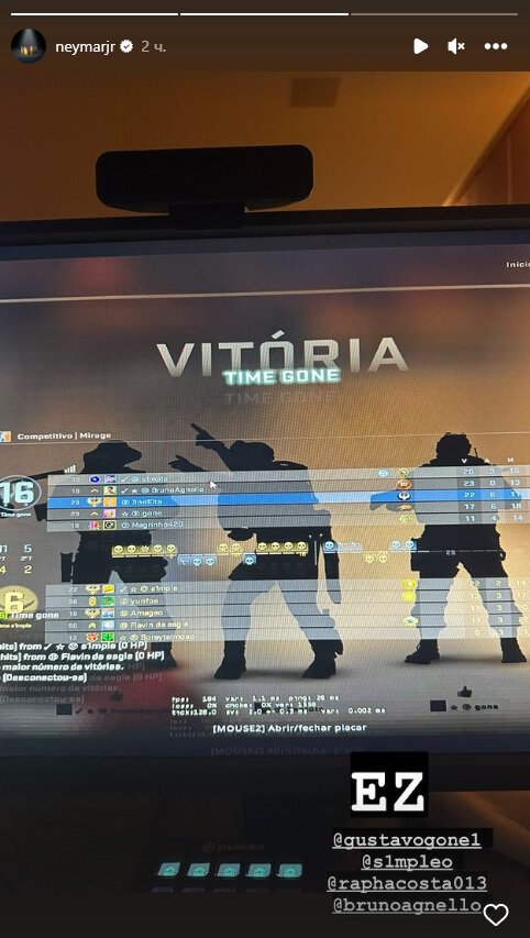 Матчем c про-игроком в CS:GO нападающий «ПСЖ», находящийся сейчас в Бразилии, похвастался в сторис.