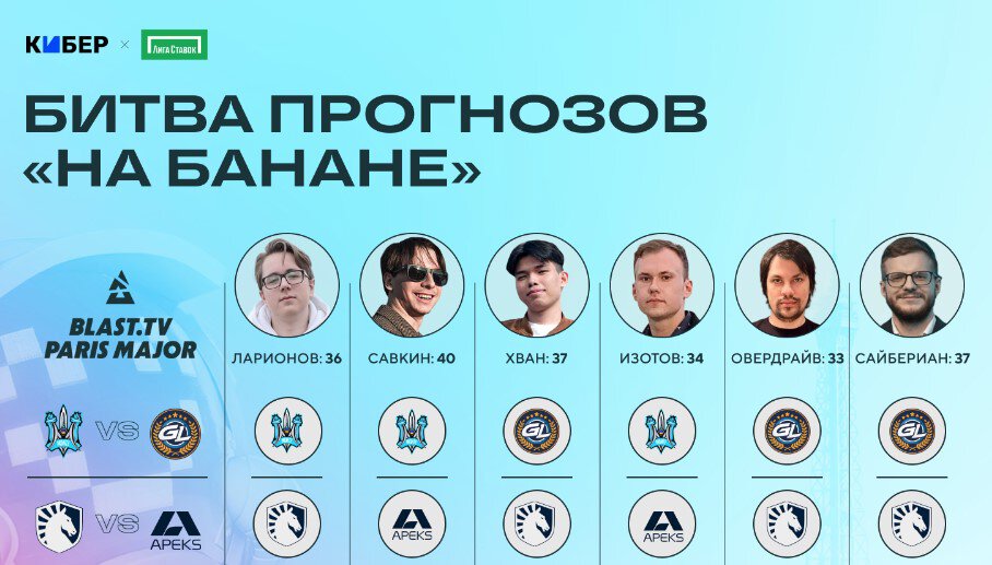 Наши авторы Игорь Ларионов, Даниил Савкин и Федя Хван, режиссер шоу «На Банане» Влад Изотов, а также аналитик и инсайдер Алексей «OverDrive» Бирюков и комментатор Дмитрий «Siberian» Коцарев делятся прогнозами на матчи BLAST Paris Major.
