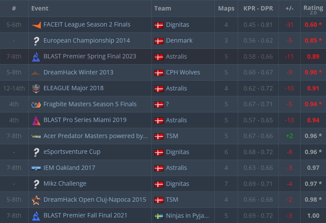Снайпер Astralis сыграл на турнире с рейтингом 0,89. Это один из самых худших показателей в его карьере.