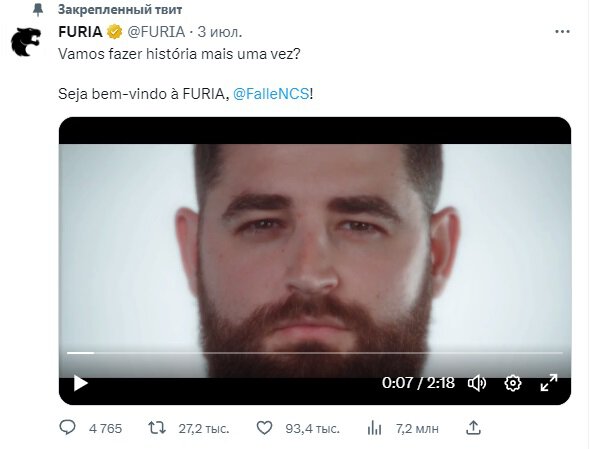3 июля Габриэль «Fallen» Толедо присоединился к Furia, твит с переходом собрал 7,2 млн просмотров.