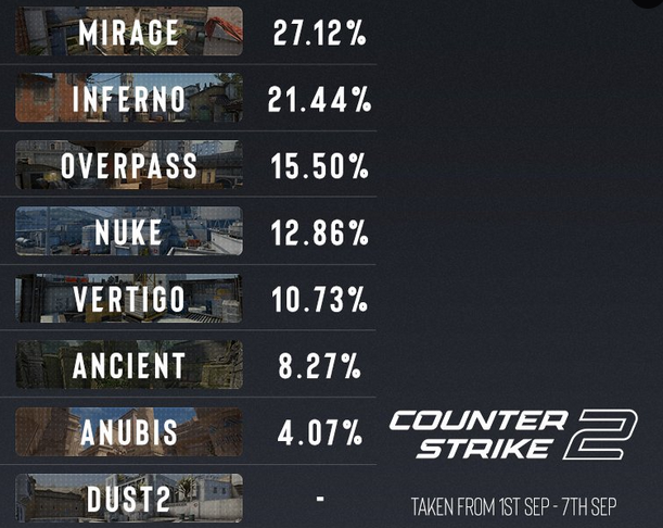 Согласно данным csgostats.gg, с 1 по 7 сентября 27,1% матчей в режиме «Премьер» в CS 2 прошло на карте Mirage – на 6% меньше, чем в CS:GO. Однако, Mirage с отрывом занимает первое место.