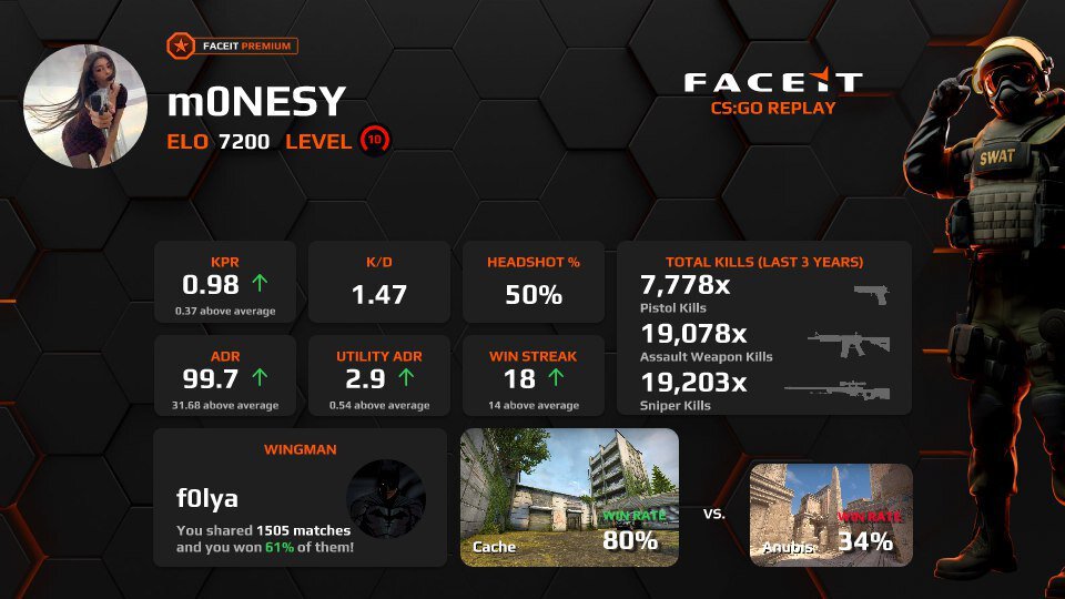 Monesy показал свою статистику на Faceit: «Лучшая карта Cache, лол)»
