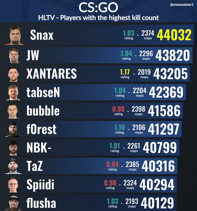 Первое место занял Snax, новый капитан GamerLegion, сделавший 44032 убийства за 2374 карты.