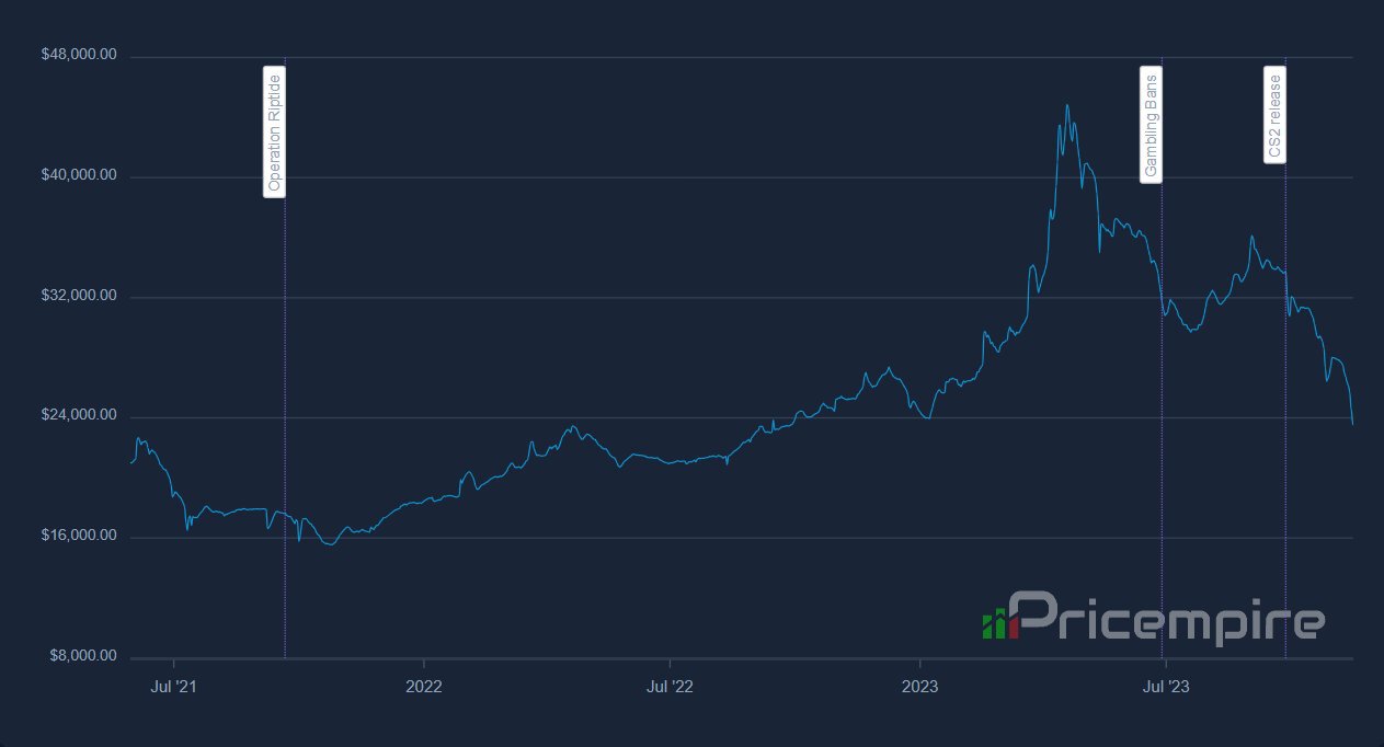 Если взять пиковое значение во время анонса даты релиза CS 2 и текущие цены на скины, падение составило почти 50%. С момента выхода CS 2 падение составило около 30%.