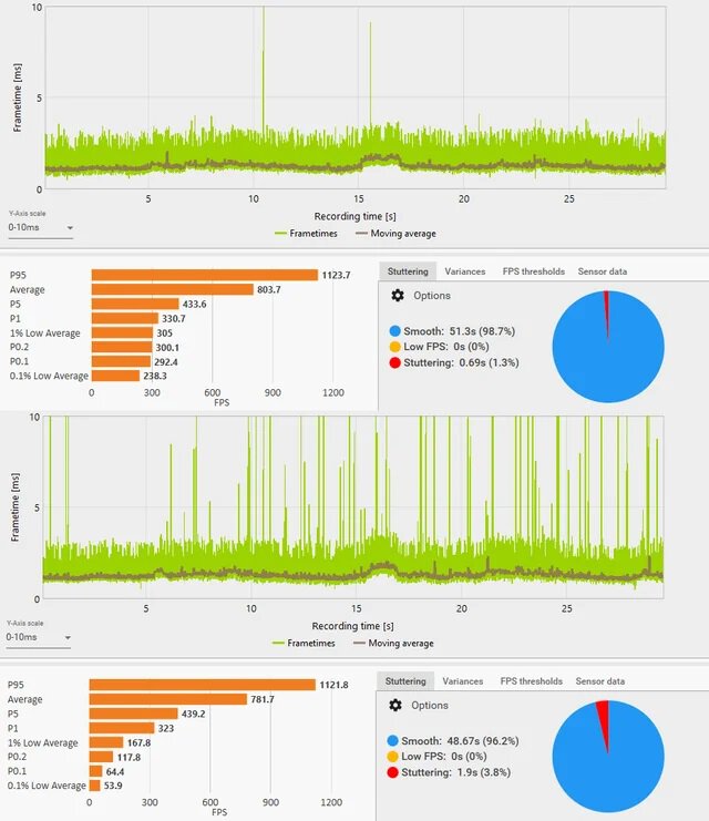После сворачивания игры подтормаживания увеличились с 1,3% до 3,8% времени при среднем FPS выше 700. Тесты проводились на ПК со следующей комплектацией: RTX 4080, i7 13700k, 5600 МГц, 32 ГБ. На более слабых ПК процент может увеличиться.