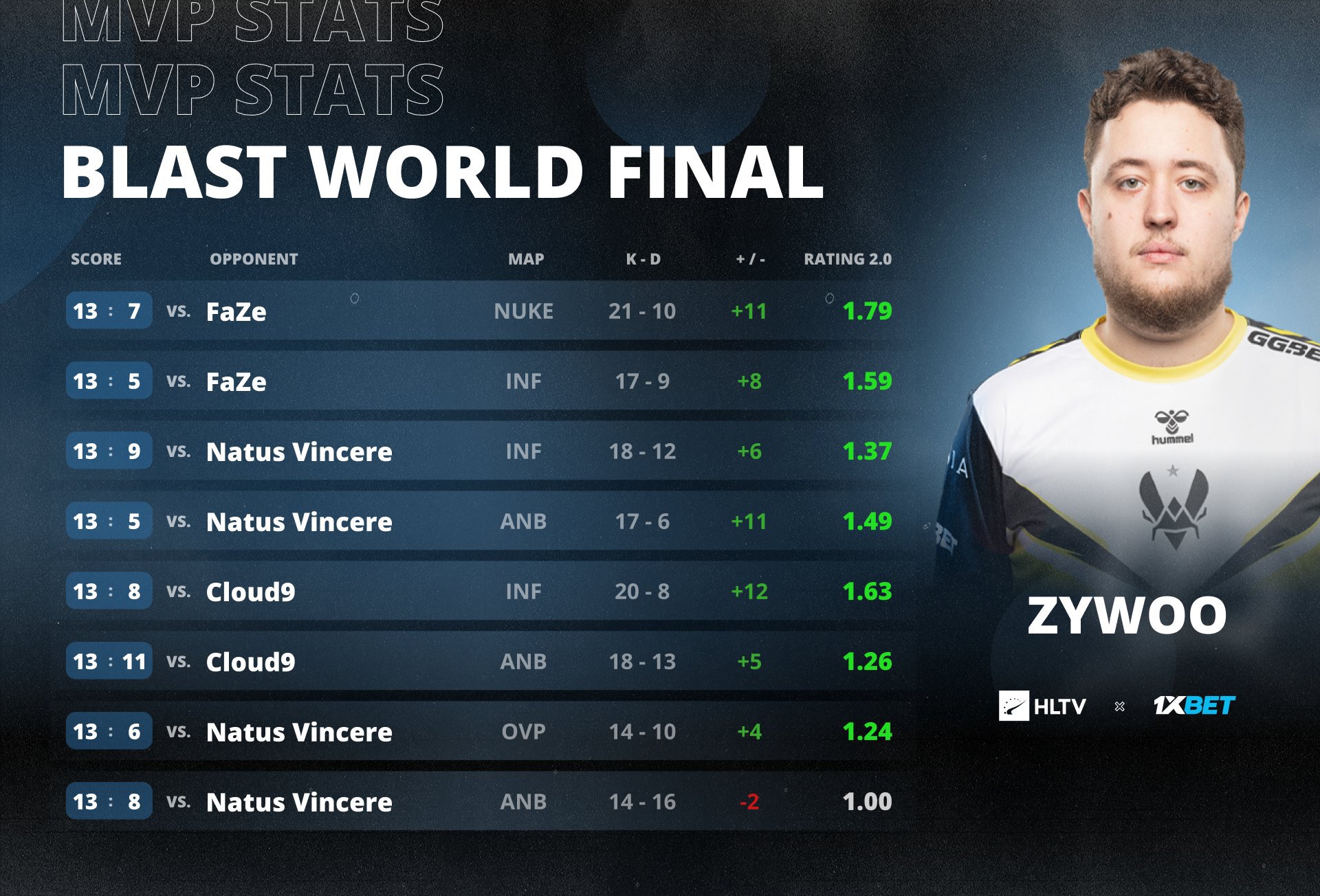 Zywoo стал лучшим игроком BLAST Premier: World Final по версии HLTV. Это его вторая медаль в CS 2