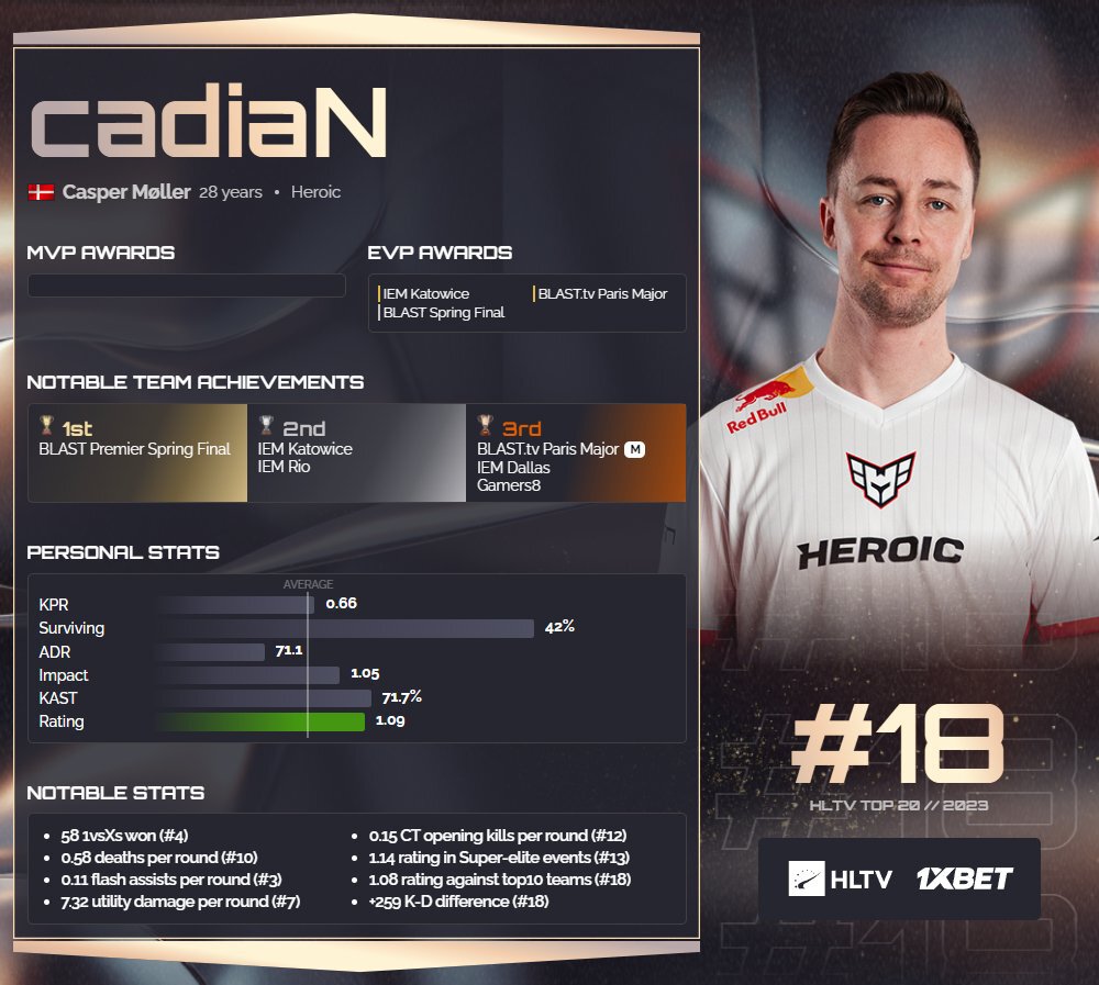 Cadian впервые в карьере попал в топ лучших игроков года HLTV. Он занял 18-е место