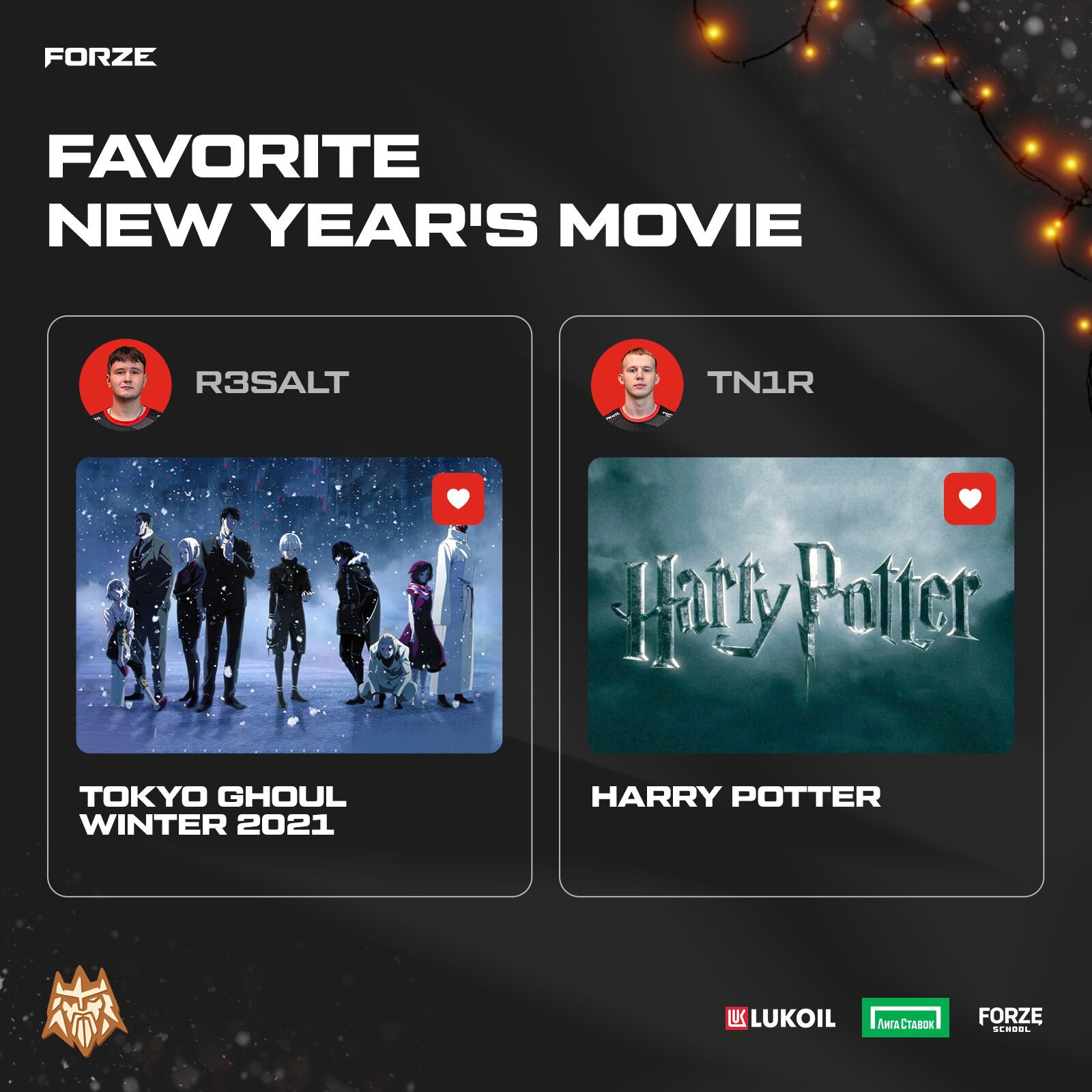 Евгений «r3salt» Фролов выбрал аниме «Токийский гуль», Андрей «Tn1r» Татаринович предпочитает смотреть на новогодние праздники «Гарри Поттера».