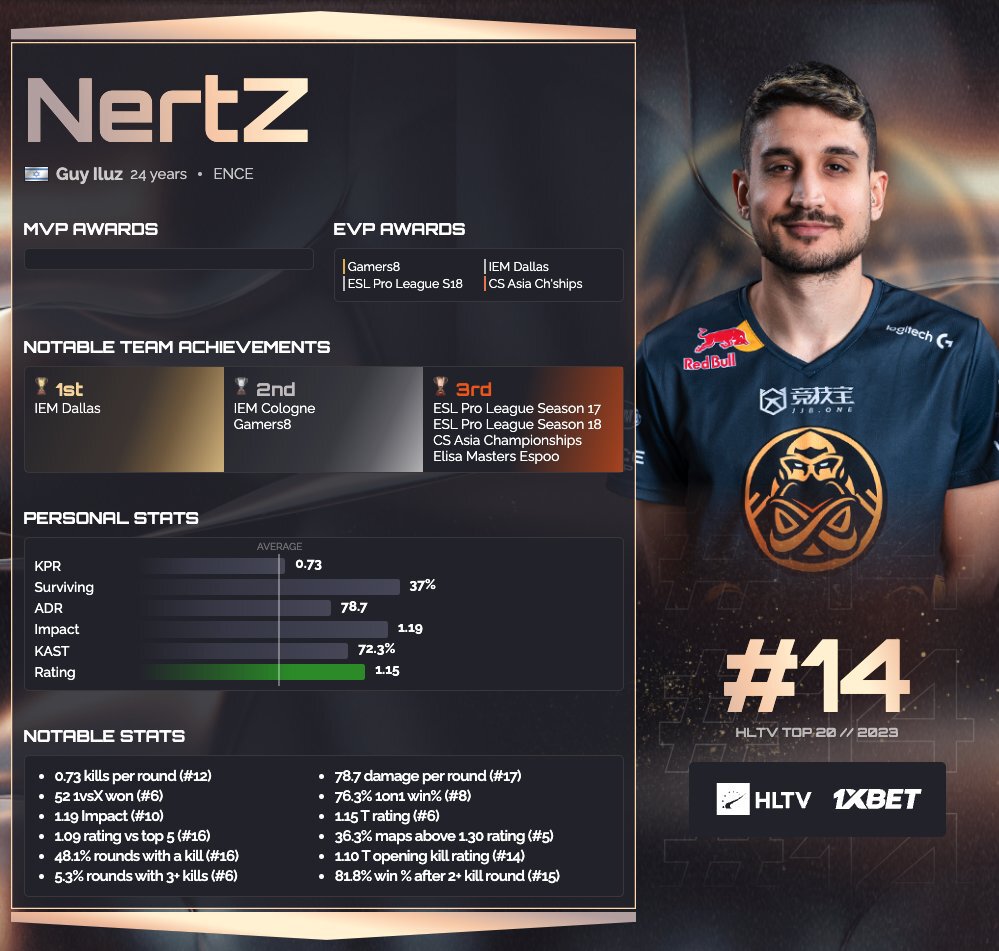 Гай «NertZ» Илуз завершил год с рейтингом 1,15 по версии издания HLTV.
