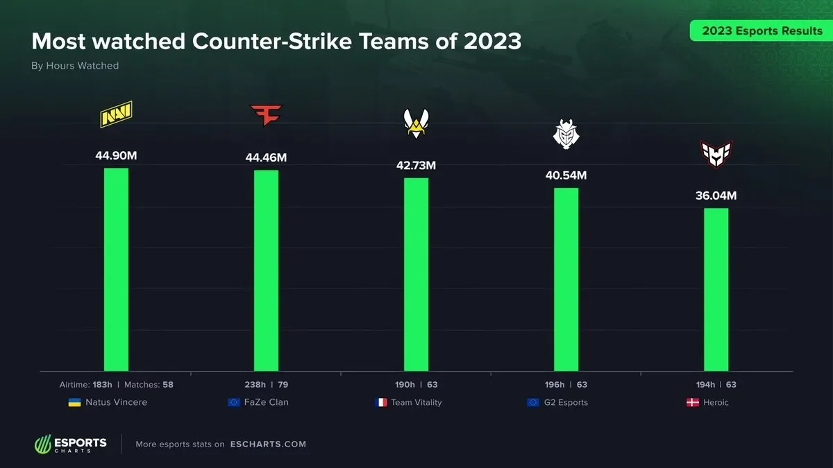 Второе место заняла FaZe с результатом в 44,45 млн часов, на третьем месте – Vitality (42,73 млн).