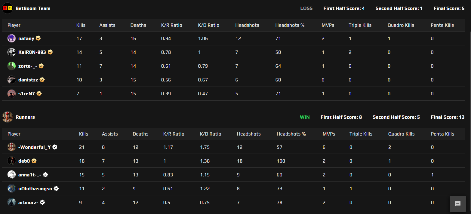 BetBoom Team проиграла миксу Runners, в состав которого входит Дмитрий «Wonderful_Y» Горкуша, топ-3 Faceit по эло, ранее игравший в Insilio, SG.pro и EC Kyiv. Матч на Vertigo завершился со счетом 5:13.
