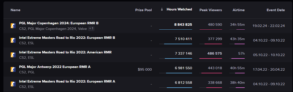 PGL Major Copenhagen 2024: European RMR B занял первое место по просмотрам за всю историю CS среди квалификаций на мейджоры – 8,84 млн часов. Пиковый онлайн составил более 480 тысяч зрителей.