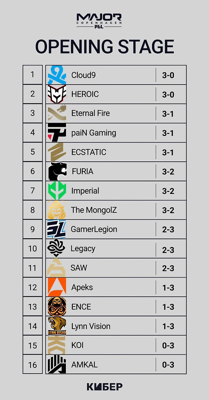 Таблица открывающей стадии PGL Major Copenhagen 2024