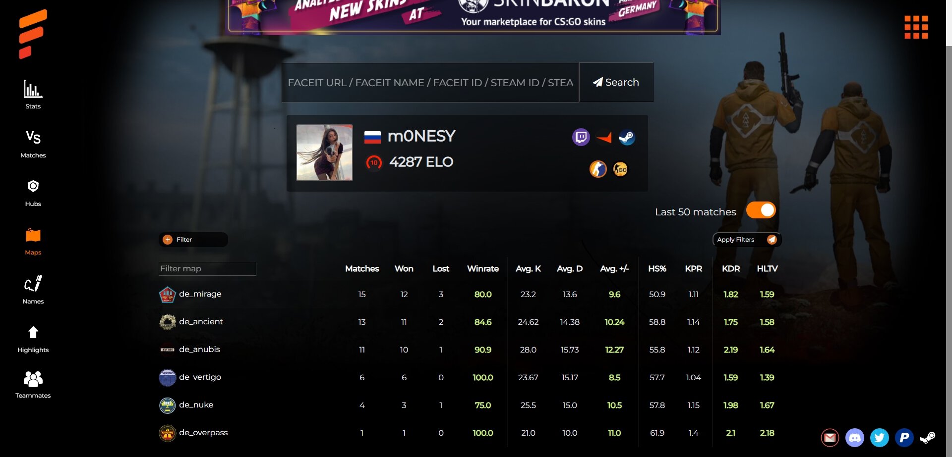 «Статистика M0nesy по последним 50 играм на Faceit. Его процент попадания в голову невероятно высок. G2 следует забанить Vertigo и просто дать ему AWP 🤣😂», – пошутил Оуэн «Smooya» Баттерфилд.