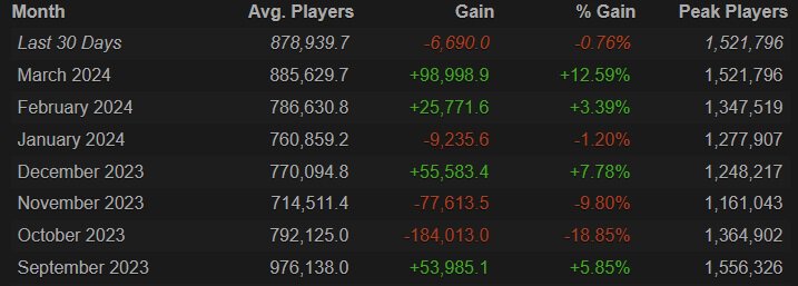 Средний онлайн шутера от Valve в марте вырос на 12,59% - с 786 до 885 тысяч игроков. Максимальный онлайн составил 1,521 млн игроков – самое большое число с сентября 2023 года.