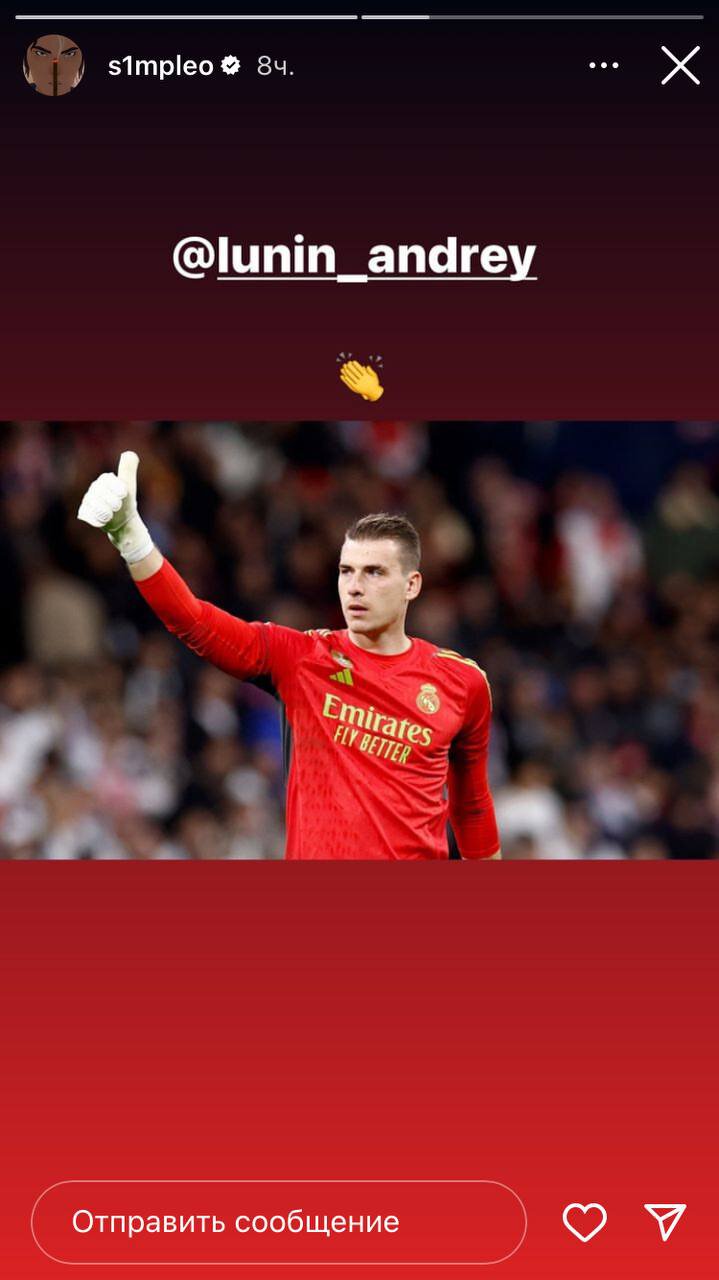Александр «S1mple» Костылев опубликовал фотографию Андрея Лунина с матча, добавив к ней эмодзи аплодисментов.