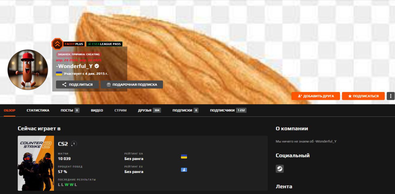 Блокировку на платформе получил Дмитрий «Wonderful_Y» Горкуша. На момент бана 23-летний украинский киберспортсмен занимал первое место на Faceit по количеству эло. Блокировка продлится 2 года.