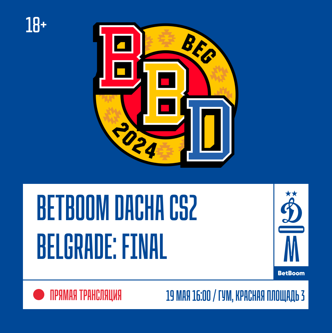 Финальный матч турнира BetBoom Dacha по CS покажут в «BetBoom Дом Динамо». Мероприятие смогут посетить только совершеннолетние зрители. Вход будет бесплатным.