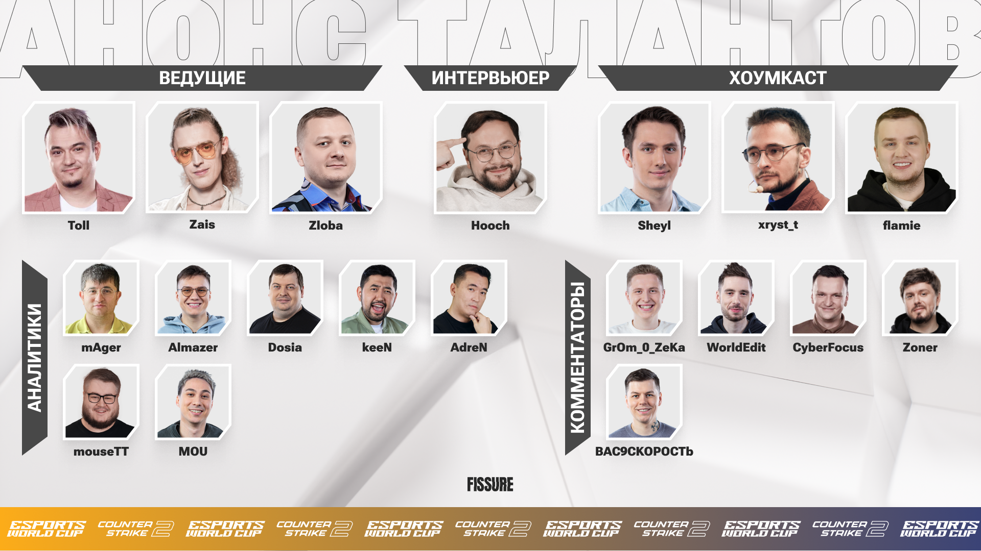 Турнирный оператор и студия киберспортивных трансляций FISSURE анонсировала список талантов и кастеров, которые будут освещать матчи по CS 2 на Esports World Cup 2024.