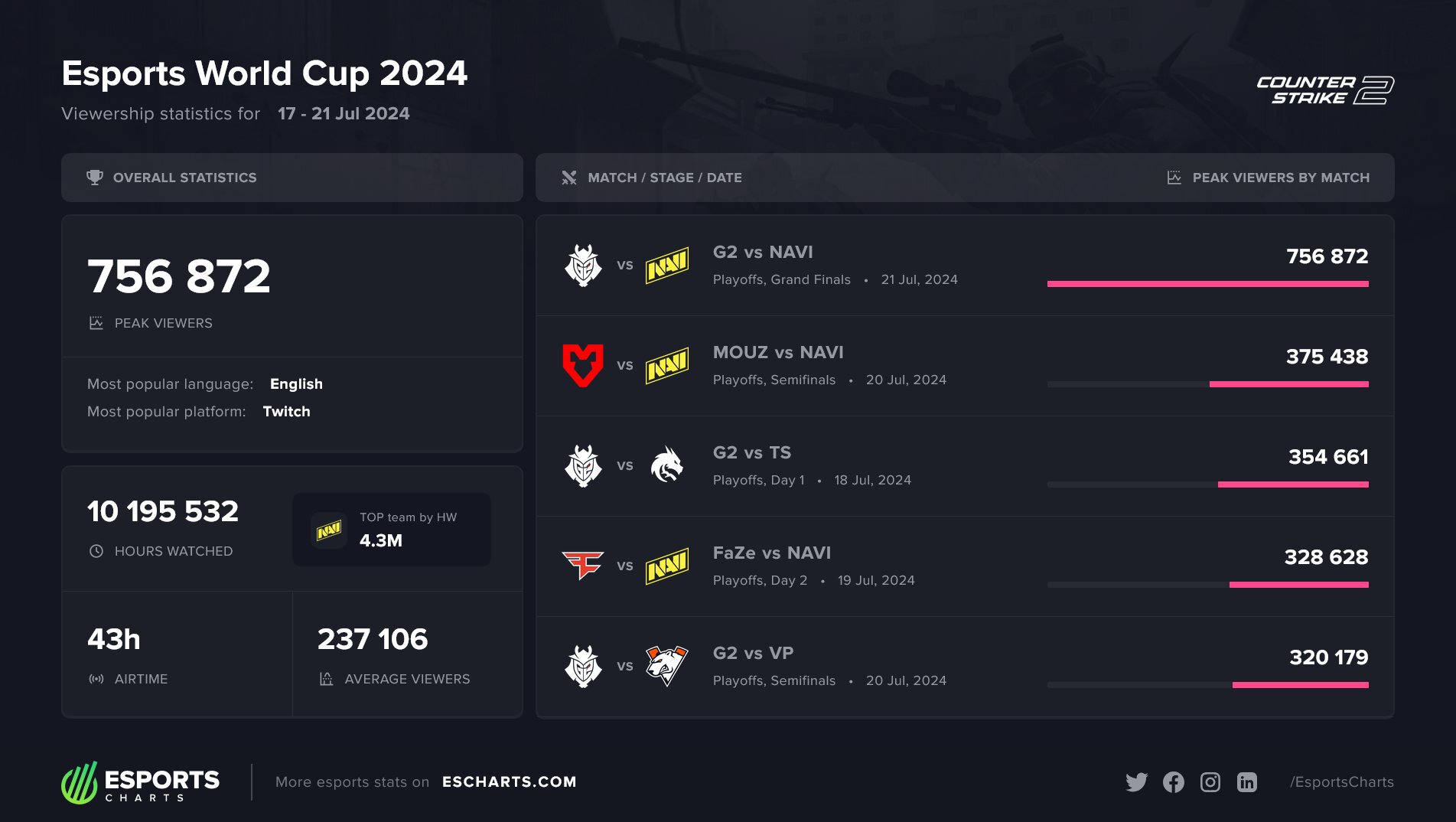 Финал NAVI – G2 на Esports World Cup смотрели в пике 756,8 тысячи зрителей