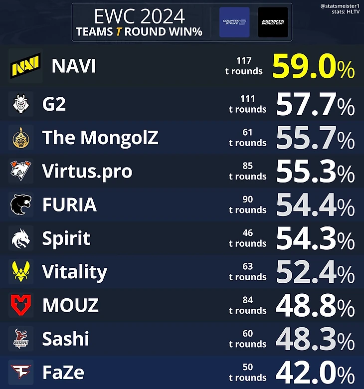 NAVI стали самой результативной командой за Т (59% выигранных раундов). В топ-3 также вошли G2 (57,7%) и The Mongolz (55,7%).
