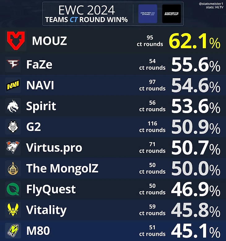 Лучшей командой за КТ стала Mouz, выигравшая 62,1% раундов за сторону защиты. NAVI заняли третье место – 54,6%.