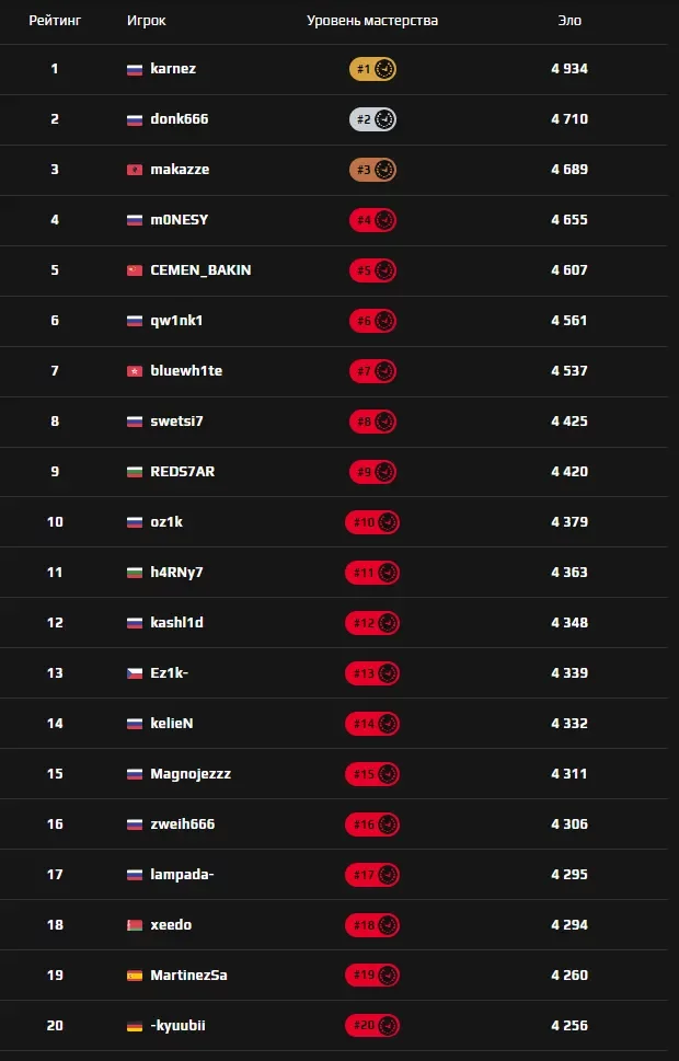 13 из топ-20 игроков ладдера Faceit родом из России, а лидирует в нем 19-летний Эрнест «karnez» Казаков из RUSTEC.