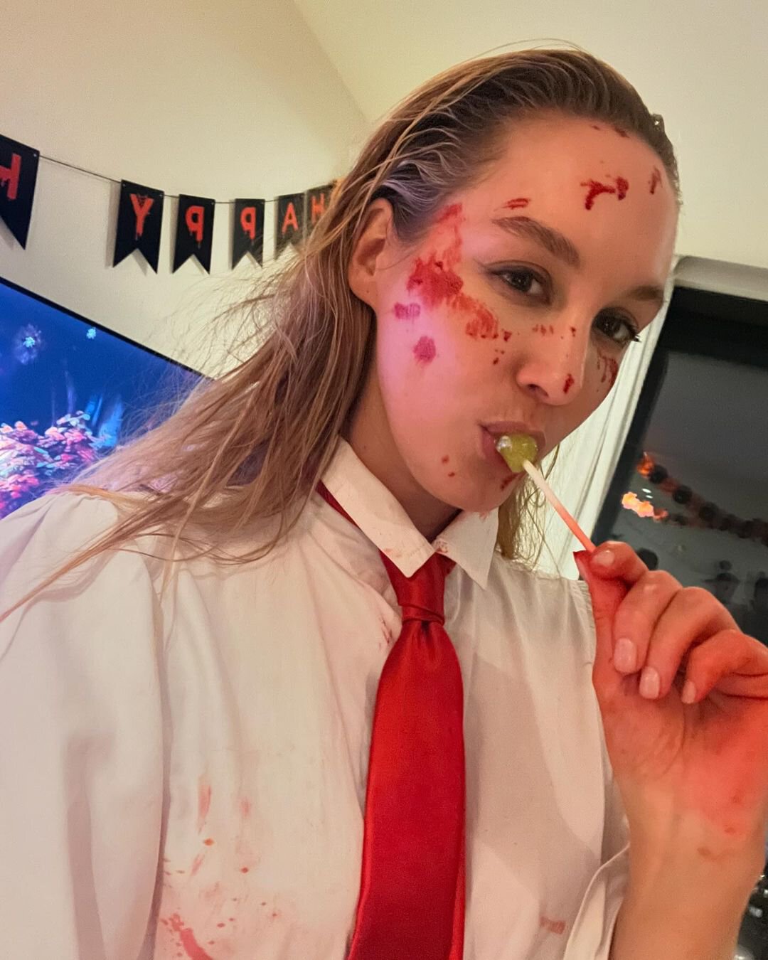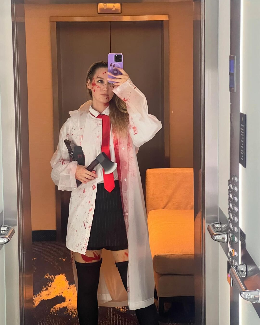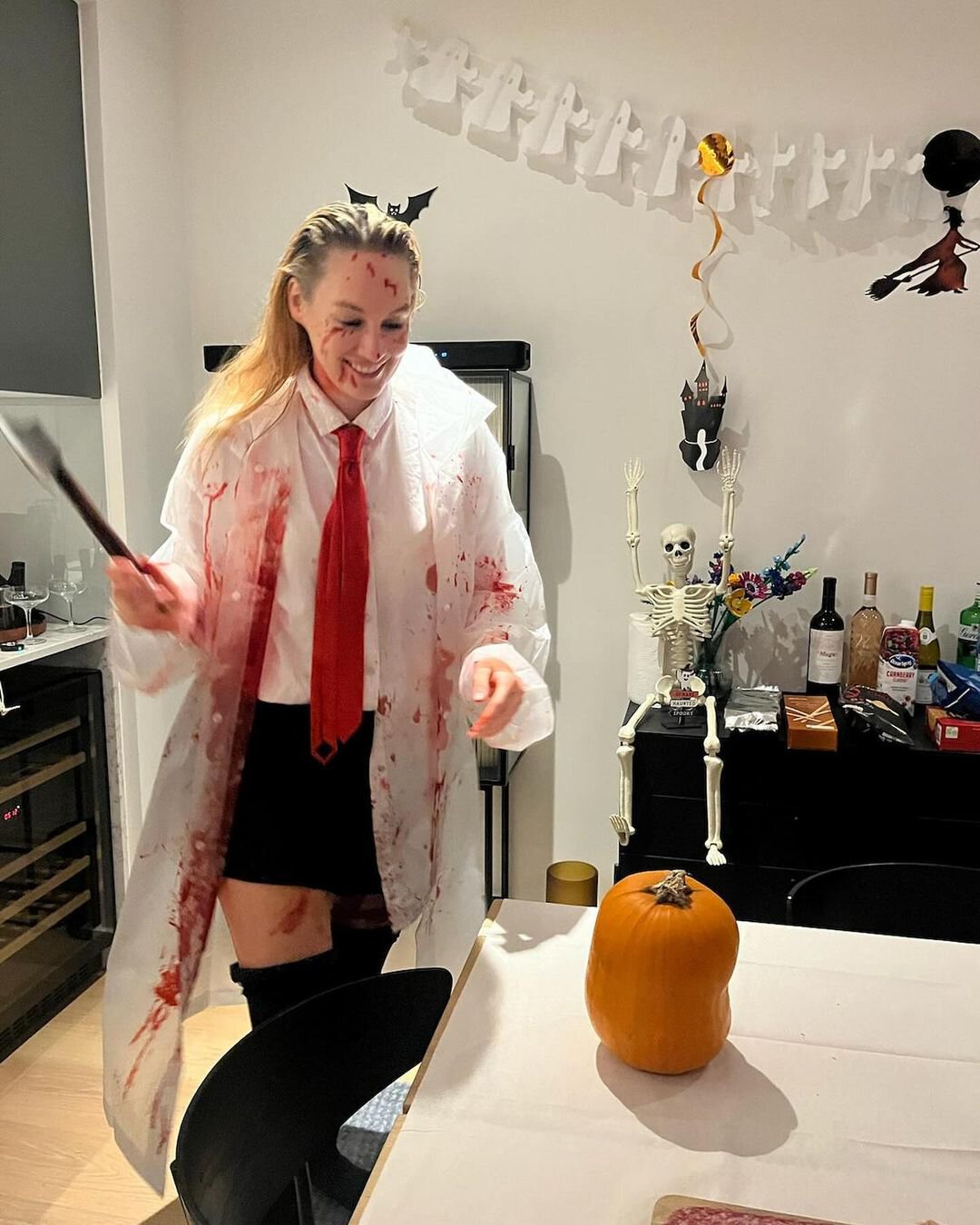 Костюм девушки был заляпан импровизированной кровью, а в руках имелся маленький топор.