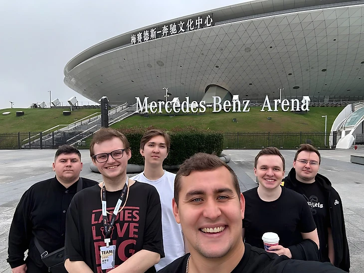 • Улыбающиеся Boombl4 и Interz на командной фотографии Cloud9 у арены в Шанхае