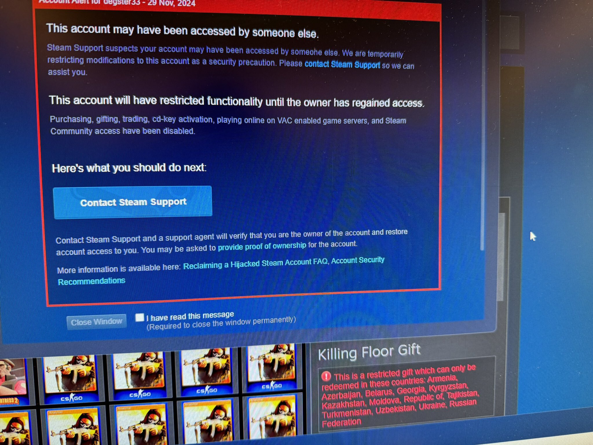 Надпись в Steam Дегстера гласит «Возможно, кто-то другой получил доступ к этой учетной записи. Функциональность этой учетной записи будет ограничена до тех пор, пока владелец не восстановит доступ».