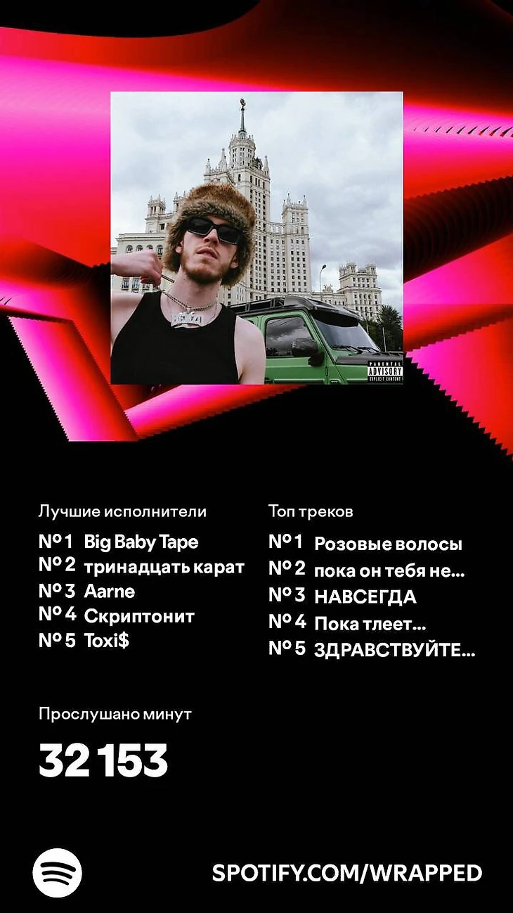 Всего рифлер BB Team прослушал 32 153 минут в сервисе. В топ исполнителей вошли Big Baby Tape, тринадцать карат, Aarne, Скриптонит и Toxi$.