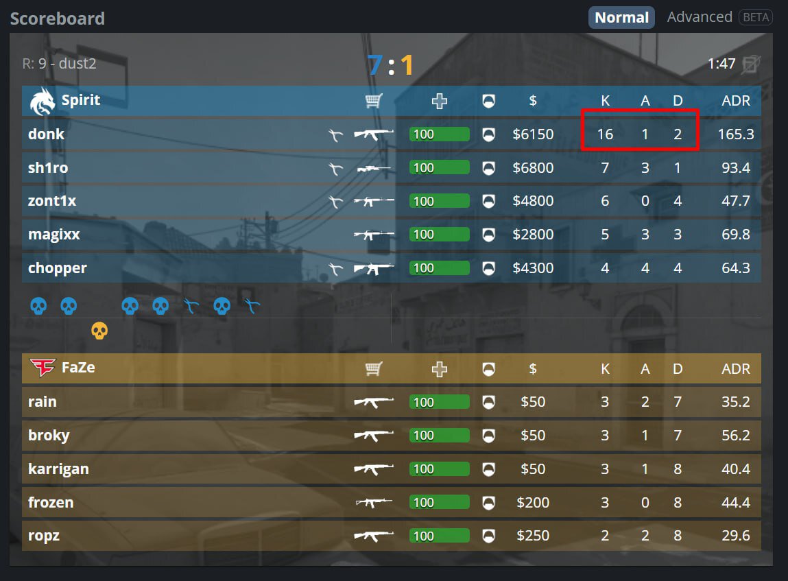 На третьей карте за 8 раундов Данил «Donk» Крышковец достиг счета 16-2.