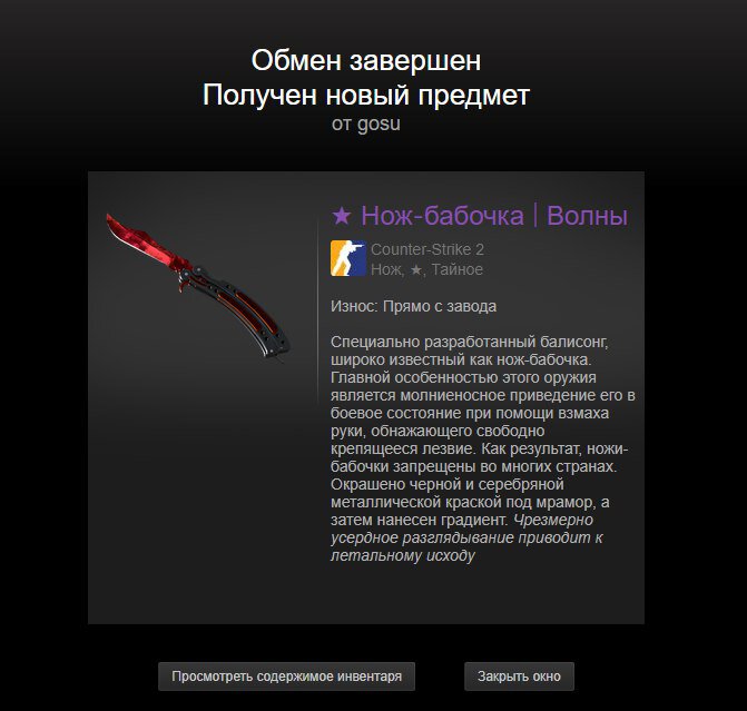 Нож-бабочка | Волны стоит от 2 тысяч долларов в зависимости от узора. Последний раз на торговой площадке Steam такой скин в состоянии прямо с завода продали за 196 тысяч рублей.